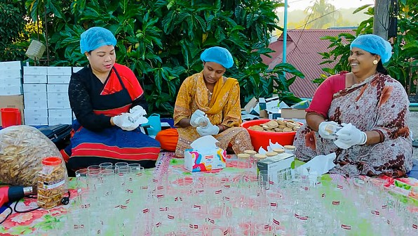 ঘরের ছাদে কলার চিপস তৈরির সময় লাকী চাকমাকে সহযোগিতা করছিলেন দুজন নারী কর্মচারী। তাঁরা ভেজে নেওয়া চিপস বয়ামে রাখছিলেন। এ ছাড়া চিপসের জন্য কলাকে পাতলা করে কেটে টুকরো করছিলেন লাকী চাকমার এক আত্মীয়।