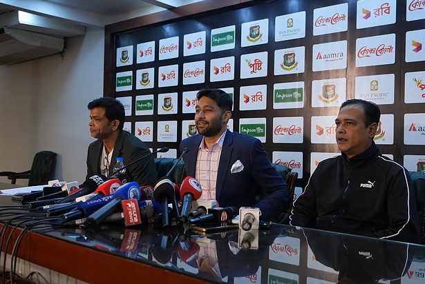 বোর্ডসভা শেষে সংবাদ সম্মেলনে কথা বলছেন বিসিবি পরিচালক আমজাদ হোসেন (মাঝে)বিসিবি
